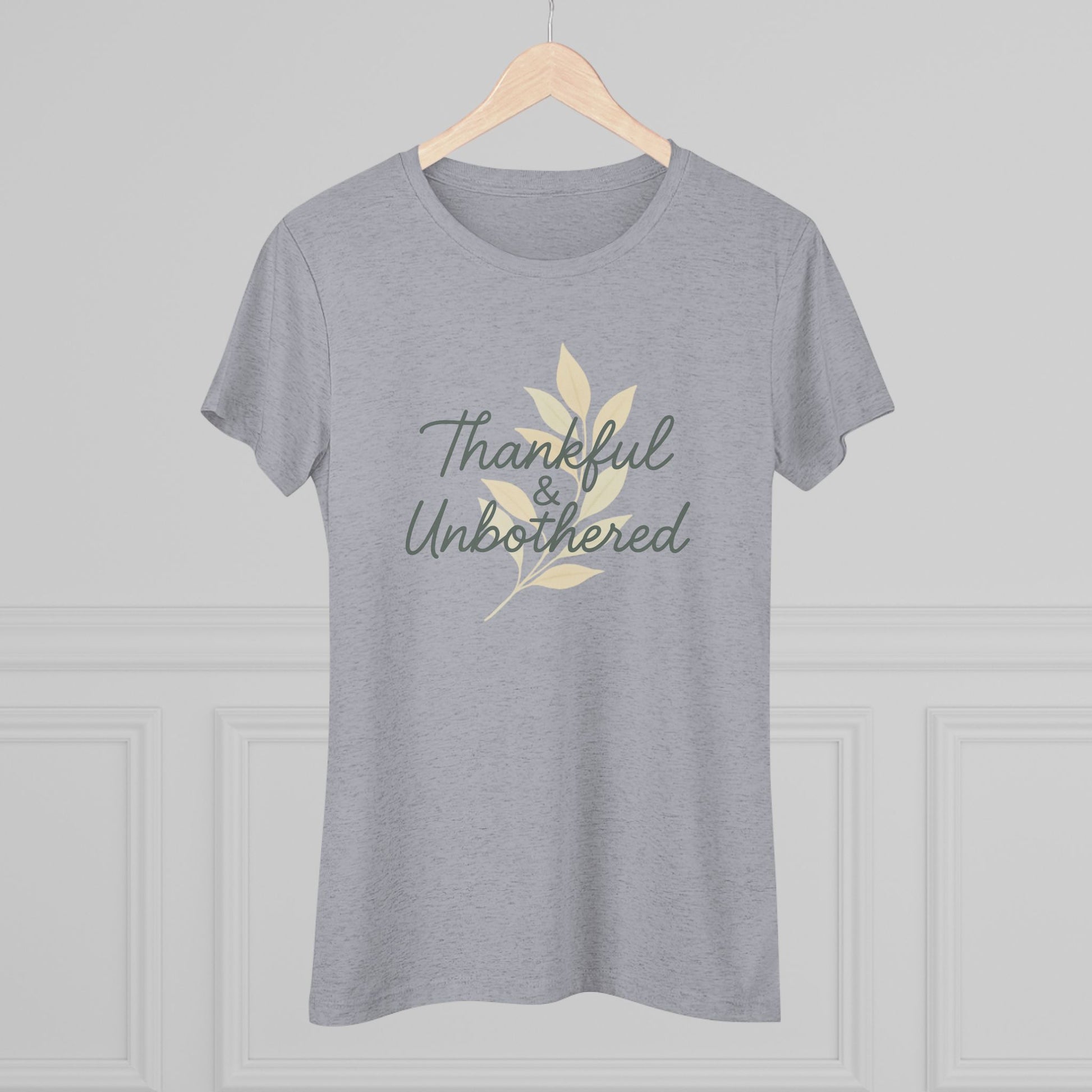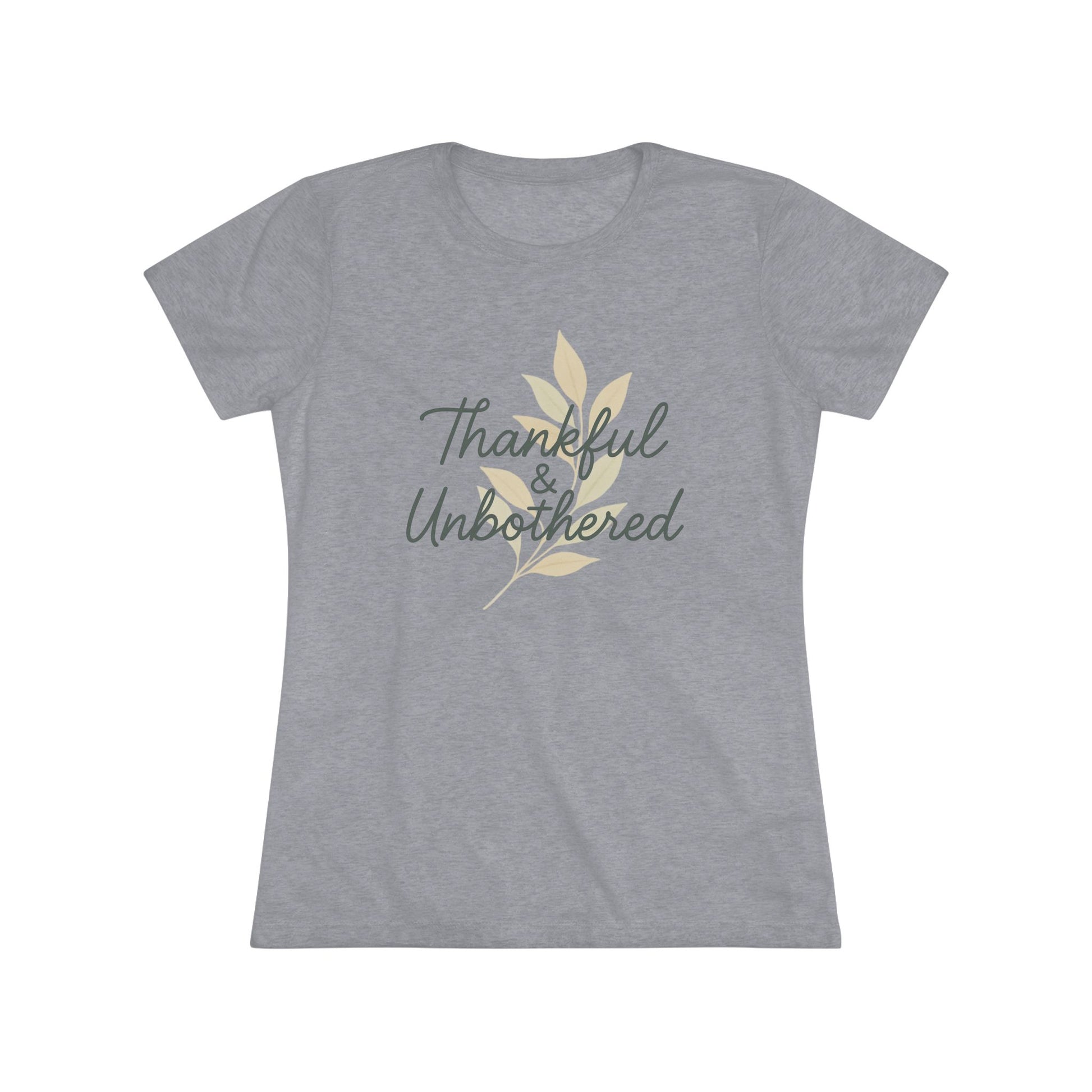 This Thankful & Unbothered Tee is made of a soft and durable fabric blend, featuring overlock side seams for structural support, self fabric shoulder and neck tape for comfort, and a ribbed knit collar with a seam for elasticity. The light fabric and slim fit make it perfect for everyday wear, giving off a positive and carefree vibe. Ideal for women looking for a comfortable yet stylish tee to wear during Thanksgiving and everyday occasions.